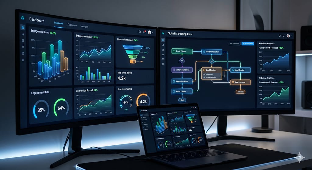 A modern office with greenery and city views, where three people discuss data on screens. Overlaid text reads: “We create AI-powered automations with a culture-first AI strategy” alongside icons for reports, lead nurturing, and bookkeeping.
